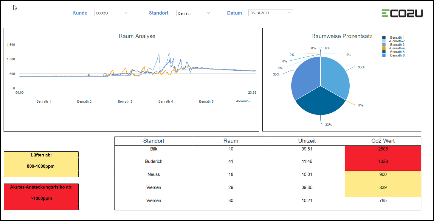 Seit dem Ausbruch von SARS-CoV-2 müssen wir genauer auf den Luftaustausch in Räumen achten. Besonders in Wohnungen, Klassenzimmern oder auch Büros wird die Luft schnell mit zu vielen Aerosolen und auch CO2 belastet. Die CO2 Konzentration ist ein Indikator für den Luftaustausch. Wir haben uns das zu Nutzen gemacht und eine intelligente Lösung entwickelt. Das Ergebnis ist das ECO2U-Ökosystem. Das Gerät wird einfach in die Steckdose gesteckt und das System ist startbereit. Im Business Intellegence basierten Auswertungsportal können Sie alle Werte Ihrer ECO2U-Geräte auf einmal sehen.